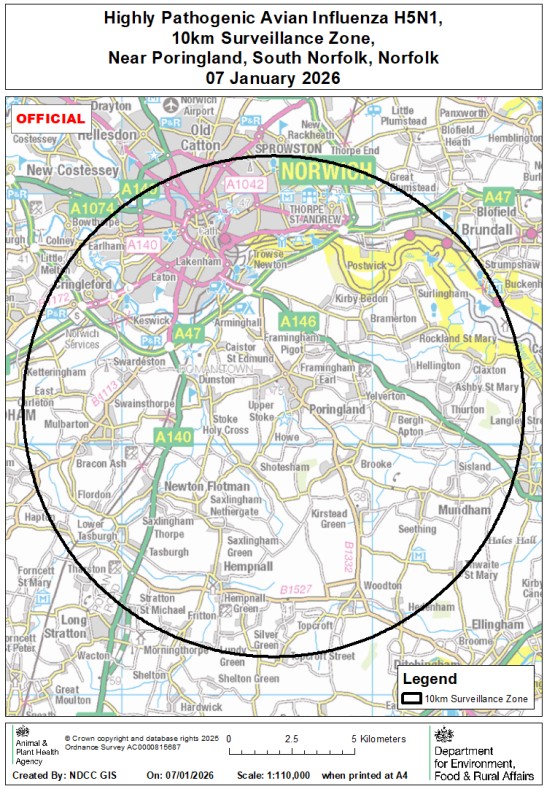 On 13 Tachwedd 2025 highly pathogenic avian influenza (HPAI) H5N1 was confirmed at a premises near Poringland, South Norfolk, Norfolk.
