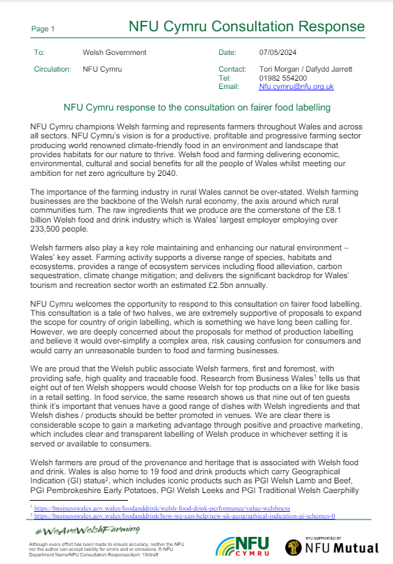 In the response to the consultation NFU Cymru expressed its support for proposals to expand the scope for country of origin labelling, something we have long been calling for. An NFU Cymru commissioned survey conducted by YouGov found that three quarters of Welsh adults (74%) view food produced in Wales as high quality and research from Business Wales found that eight out of ten Welsh shoppers would choose Welsh for top products on a like for like basis in a retail setting. NFU Cymru believes that clear front of pack country of origin labelling can help consumers make informed purchasing decisions and allow them to select goods which are produced by Welsh farmers.