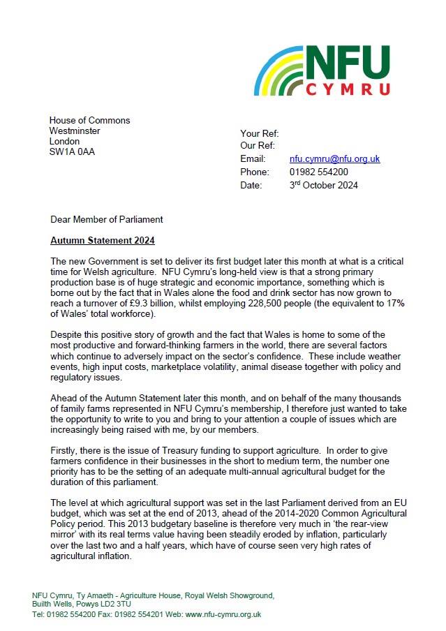 Ahead of the Autumn Statement later this month, and on behalf of the many thousands of family farms represented in NFU Cymru’s membership, NFU Cymru therefore wanted to take the opportunity to write to MPs and bring to their attention a couple of issues which are increasingly being raised with us, by our members.