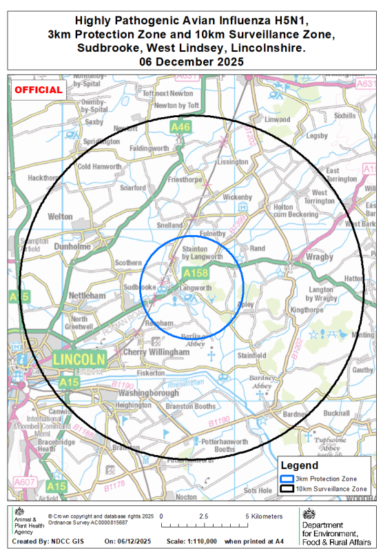 On 6 December 2025 highly pathogenic avian influenza (HPAI) H5N1 was confirmed at a premises near Sudbrooke, West Lindsey, Lincolnshire. A 3km Protection Zone and 10km Surveillance Zone have been put in place around the premises (see map).
