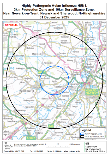 On 26 December 2025 highly pathogenic avian influenza (HPAI) H5N1 was confirmed at a premises near Newark-on-Trent, Newark and Sherwood, Nottinghamshire. A 3km Protection Zone and 10km Surveillance Zone have been put in place around the premises (see map).