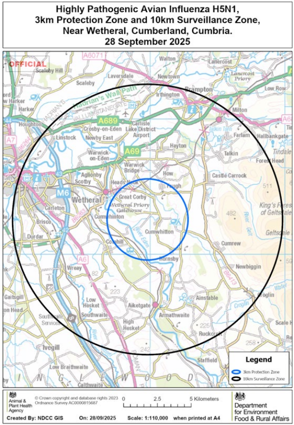 On 28 September 2025 highly pathogenic avian influenza (HPAI) H5N1 was confirmed at a premises near Wetheral, Cumberland, Cumbria.