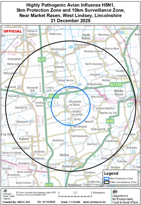 On 21 December 2025 highly pathogenic avian influenza (HPAI) H5N1 was confirmed at a premises near Market Rasen, West Lindsey, Lincolnshire. A 3km Protection Zone and 10km Surveillance Zone have been put in place around the premises (see map).