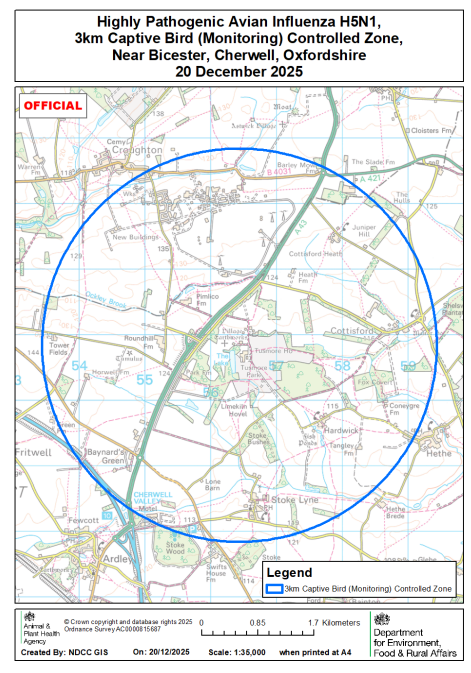 On 20 December 2025 highly pathogenic avian influenza (HPAI) H5N1 was confirmed at a premises near Bicester, Cherwell, Oxfordshire. A 3km Captive Bird (Monitoring) Controlled Zone has been put in place around the premises (see map).