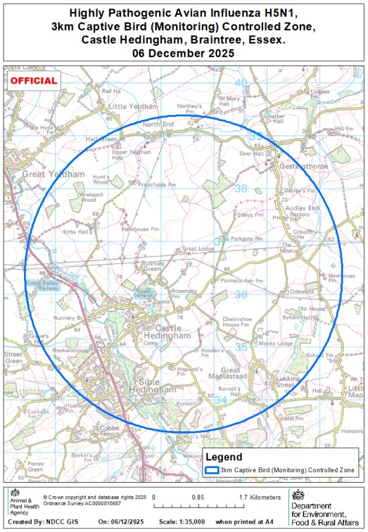 On 6 December 2025 highly pathogenic avian influenza (HPAI) H5N1 was confirmed at a premises near Castle Hedingham, Braintree, Essex. A 3km Captive Bird (Monitoring) Controlled Zone has been put in place around the premises (see map).