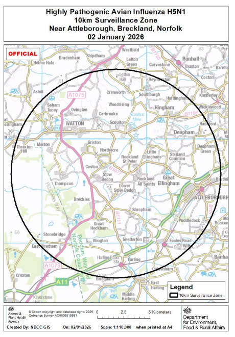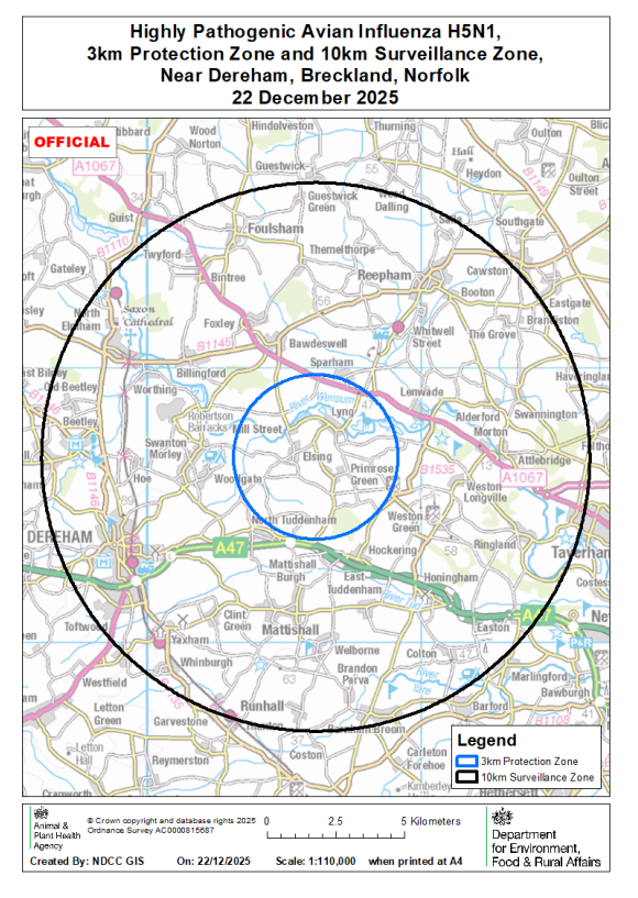 On 20 December 2025 highly pathogenic avian influenza (HPAI) H5N1 was confirmed at a premises near Dereham, Breckland, Norfolk. A 3km Protection Zone and 10km Surveillance Zone have been put in place around the premises (see map).