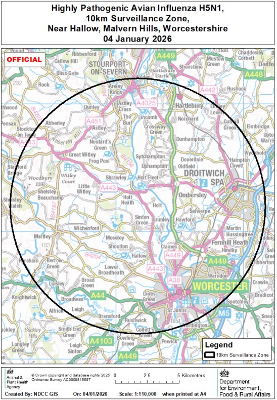On 27 December 2025 highly pathogenic avian influenza (HPAI) H5N1 was confirmed at a premises near Alvechurch, Bromsgrove, Worcestershire. A 3km Protection Zone and 10km Surveillance Zone have been put in place around the premises (see map).