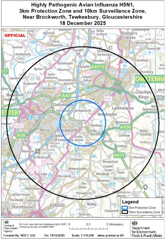 On 18 December 2025 highly pathogenic avian influenza (HPAI) H5N1 was confirmed at a premises near Brockworth, Tewkesbury, Gloucestershire. A 3km Protection Zone and 10km Surveillance Zone have been put in place around the premises (see map).