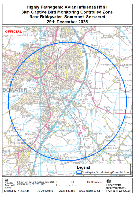 On 29 December 2025 highly pathogenic avian influenza (HPAI) H5N1 was confirmed at a premises near Bridgewater, Somerset. A 3km Captive Bird (Monitoring) Controlled Zone has been put in place around the premises (see map).