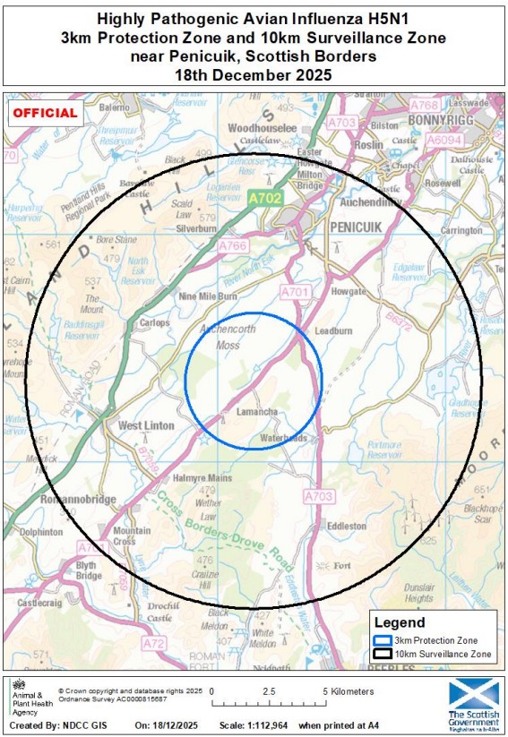 On 18 December 2025 highly pathogenic avian influenza (HPAI) H5N1 was confirmed at a premises near Penicuik, Scottish Borders. A 3km Protection Zone and 10km Surveillance Zone have been put in place around the premises (see map).