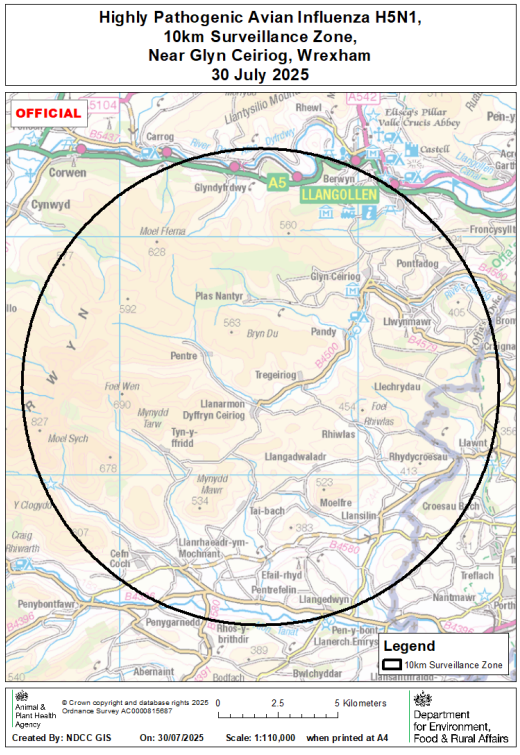 On 9 November 2025 highly pathogenic avian influenza (HPAI) H5N1 was confirmed at a premises near Welshpool, Powys, Wales . A 3km Protection Zone and 10km Surveillance Zone have been put in place around the premises (see map).