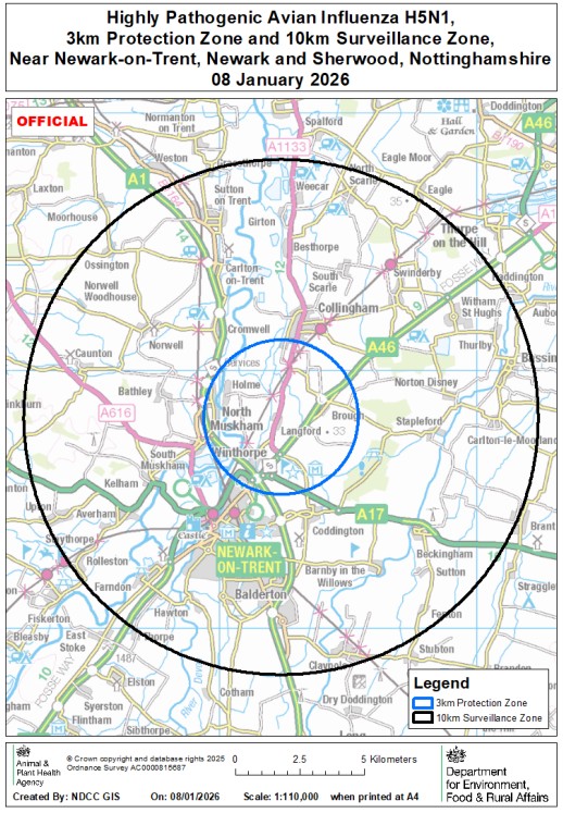 On 8 January 2026 highly pathogenic avian influenza (HPAI) H5N1 was confirmed at a premises near Newark-on-Trent, Newark and Sherwood, Nottinghamshire. A 3km Protection Zone and 10km Surveillance Zone have been put in place around the premises (see map).