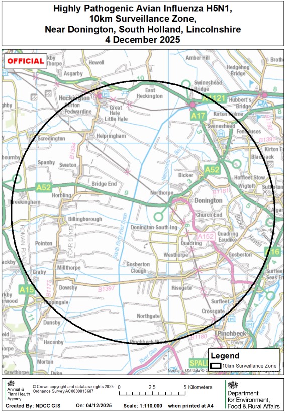 On 1 November 2025 highly pathogenic avian influenza (HPAI) H5N1 was confirmed at a premises near Donington, South Holland, Lincolnshire. A 3km Protection Zone and 10km Surveillance Zone have been put in place around the premises (see map).
