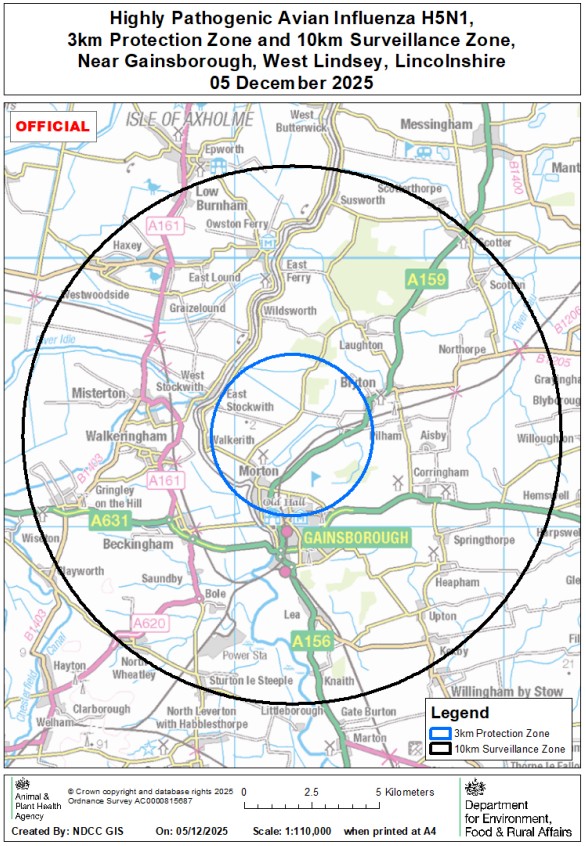 On 23 November 2025 highly pathogenic avian influenza (HPAI) H5N1 was confirmed at a premises near Gainsborough, West Lindsey, Lincolnshire. A 3km Protection Zone and 10km Surveillance Zone have been put in place around the premises (see map).