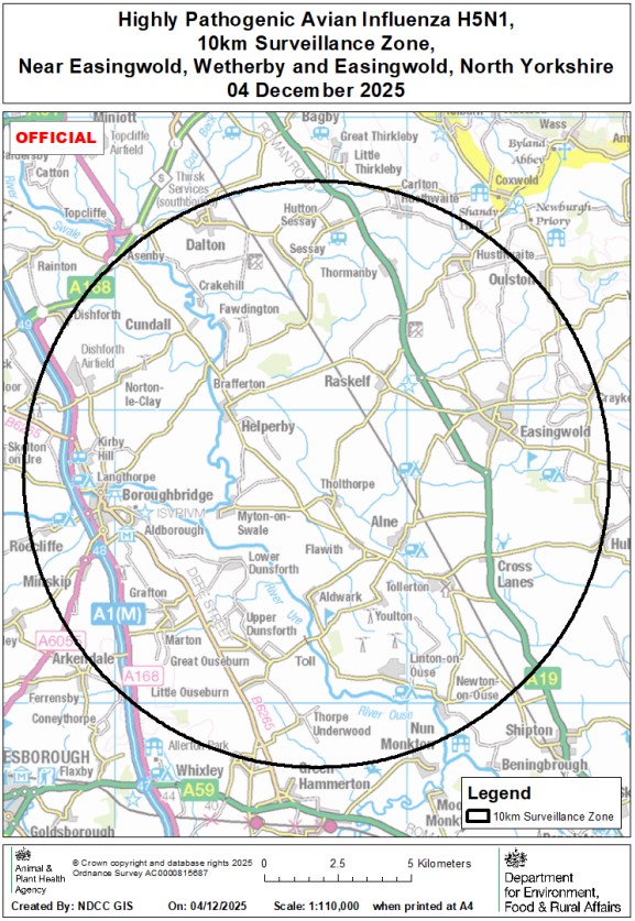 On 2 November 2025 highly pathogenic avian influenza (HPAI) H5N1 was confirmed at a premises near Near Easingwold, Wetherby and Easingwold, North Yorkshire. A 3km Protection Zone and 10km Surveillance Zone have been put in place around the premises (see map).
