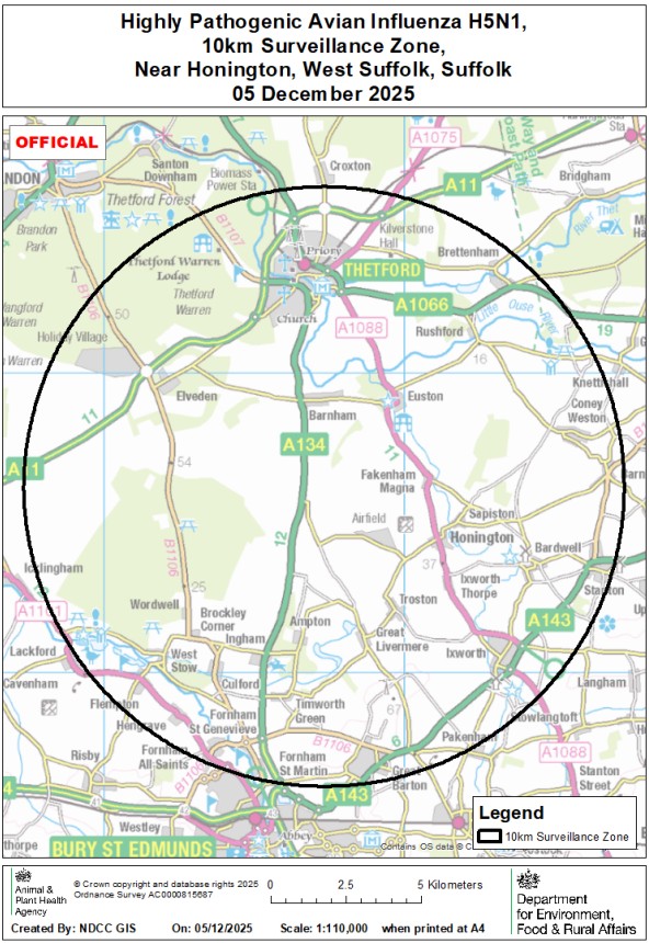 On 25 November 2025 highly pathogenic avian influenza (HPAI) H5N1 was confirmed at a premises near Mundford, Breckland, Norfolk. A 3km Protection Zone and 10km Surveillance Zone have been put in place around the premises (see map).