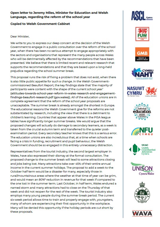 In the letter, the organisations state that in the Welsh Government Commissioned ‘Beaufort Report’, the key findings state that ‘the majority of participants were content with the shape of the current school year’. The letter also states that the education unions are in complete agreement that the reform of the school year proposals are ‘unacceptable’.