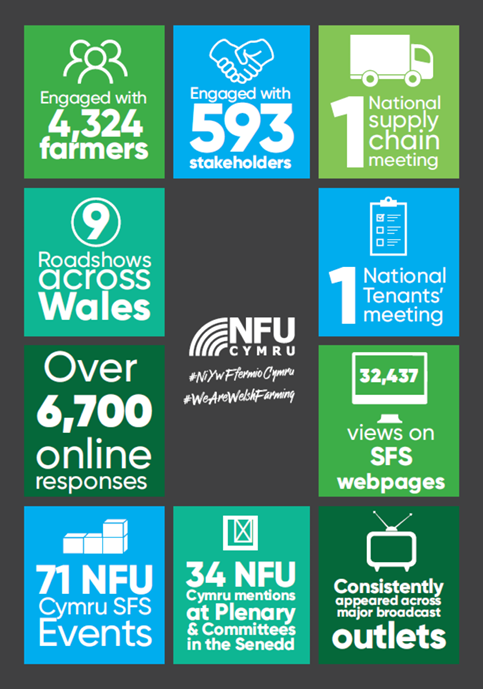 Over 6,700 farmers responded to the Welsh Government consultation via the NFU Cymru website, more than doubling the previous highest response received by the union for any such engagement exercise. Over the course of the 12-week consultation period, NFU Cymru engaged with over 5,000 farmers and supply chain partners at roadshows, county meetings, board meetings, market visits and other events.