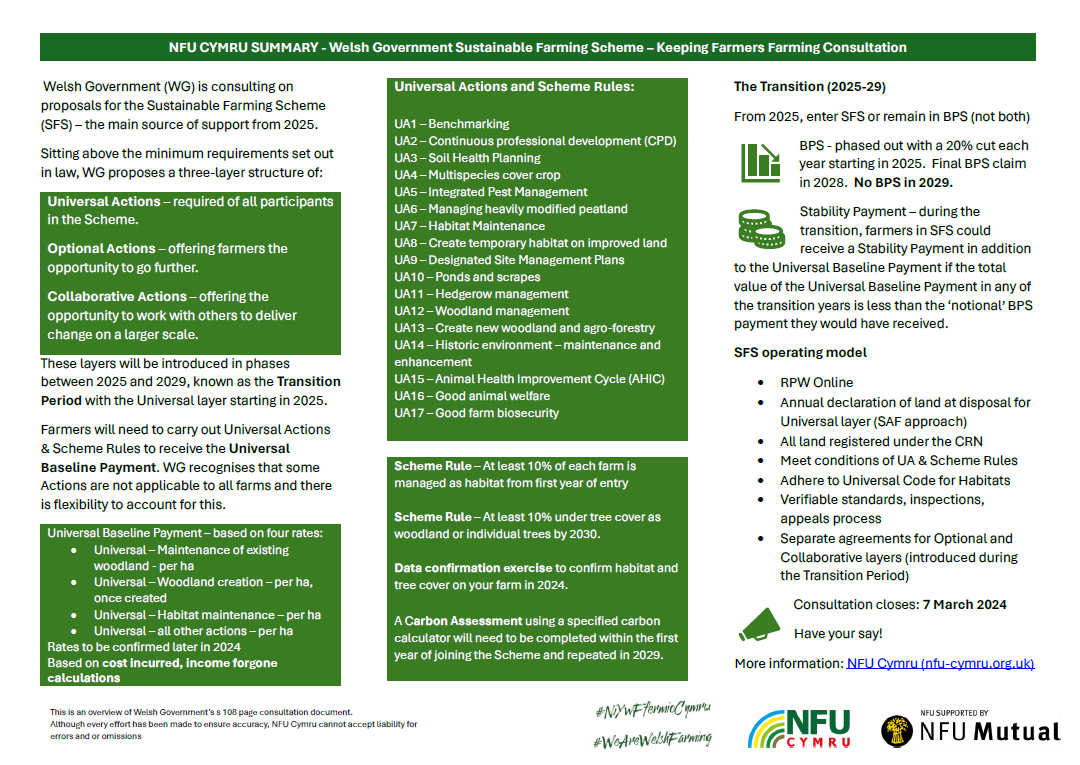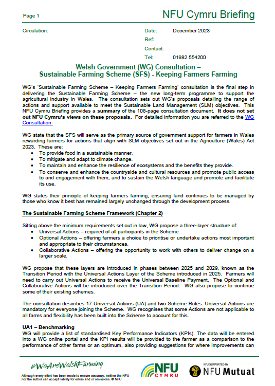 The consultation builds on the outline proposals for the scheme set out by Welsh Government as part of its consultation in 2022 and NFU Cymru is pleased that in its publication, Welsh Government continues to recognise the case for supporting farmers and the need for a universal set of actions that all farmers in Wales should undertake in return for a universal baseline payment.